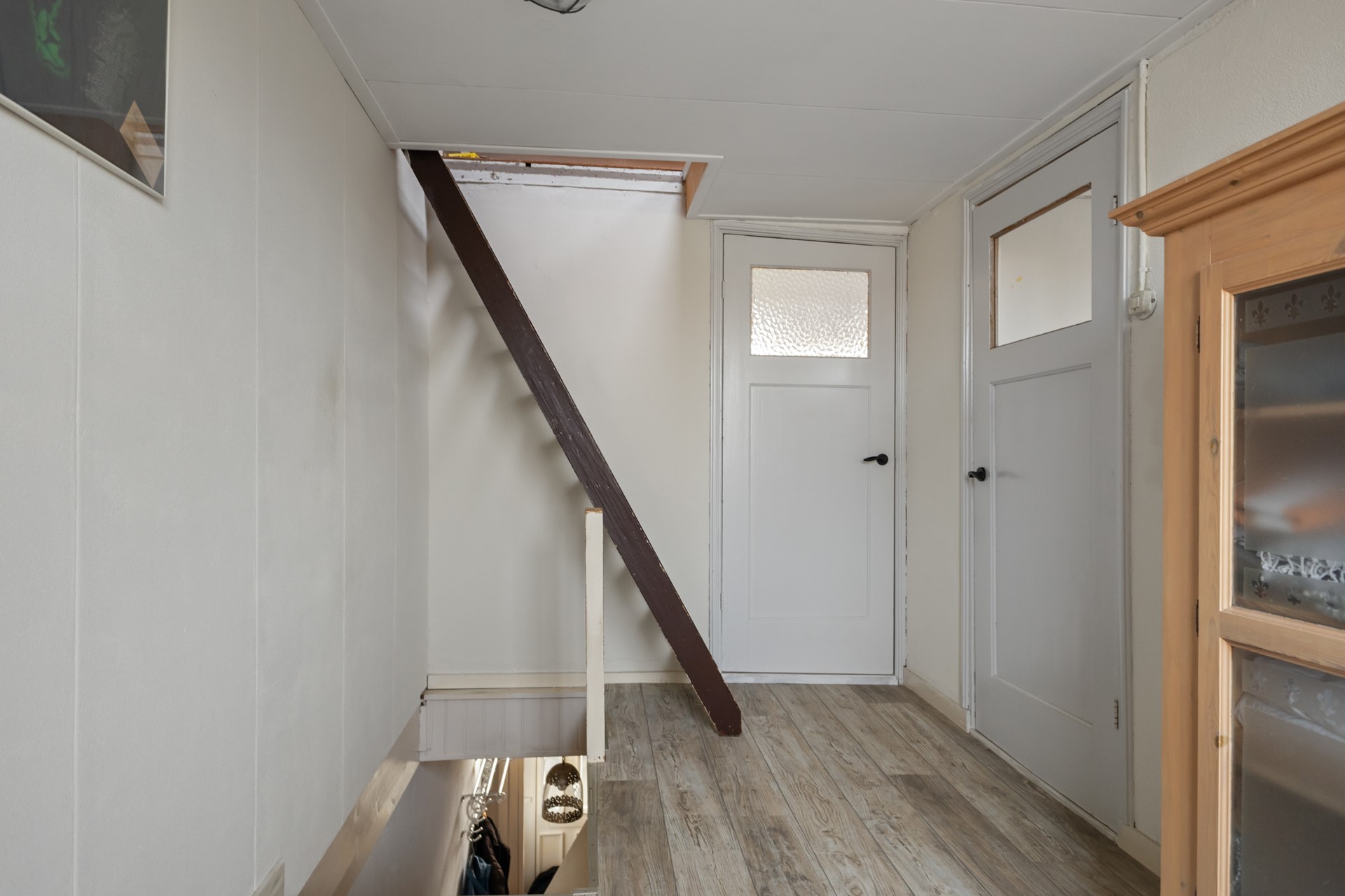 entree, hal met meterkast en trapopgang, woonkamer met aan de voorzijde een erker en de zithoek met gashaard. Aan de achterzijde in de aanbouw de woonkeuken met plavuizenvloer met vloerverwarming (tevens vloerverwarming in de bijkeuken en badkamer). De aanbouw heeft fraaie daklichten, welke de woonkamer voorziet van meer daglichttoetreding. De bijkeuken biedt ruimte voor een CV ketel en aansluitingen voor het witgoed, daarna volgt het toilet en de badkamer. Via de trap in de hal is de verdieping te bereiken, hier een royale overloop met toegang tot twee slaapkamers met aan de voor- en achterzijde zeer goed kunststof kozijnen met hr++ beglazing. Via een vaste trap is de bergzolder te bereiken. Achter de woning een westelijk gelegen achtertuin met achterom.