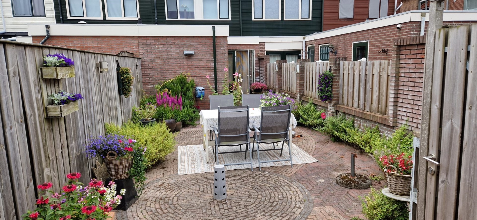 De diepe achtertuin, gelegen op het westen, biedt voldoende ruimte om te kunnen ontspannen. Achter in de tuin staat er nog een stenen berging.