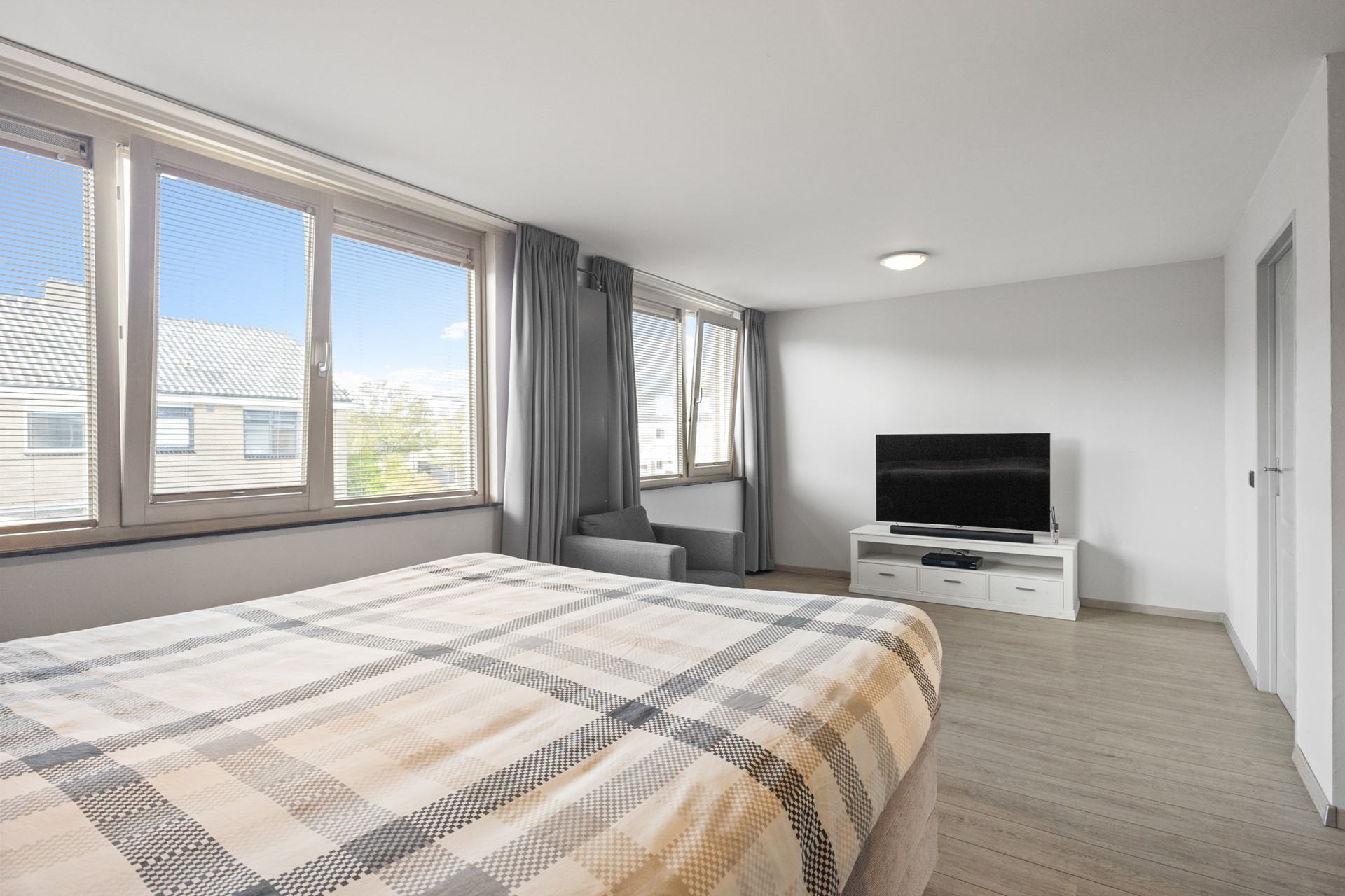 Entree woning in een voorportaal met overdekte toegang naar de frontberging. Je komt de woning binnen in de hal met meterkast en het toilet die toegang biedt tot de royale en tuingerichte woonkamer voorzien van grote glaspartijen in de achtergevel, dubbel openslaande tuindeuren wat de woonkamer een geweldige lichtinval geeft en daardoor nog ruimtelijker maakt. Aan de voorzijde op de begane grond is de open keuken gesitueerd. Een nette, volledige functionele inbouwkeuken, in een hoekopstelling geplaatst, voorzien van veel werk- en bergruimte en al het gewenste inbouwapparatuur als een koelkast, combi-oven, gaskookplaat en vaatwasser. Op de eerste verdieping is er een kleine aanpassing gedaan aan de indeling waardoor er een riante master-bedroom is ontstaan over de gehele breedte (ca. 6 meter) van de woning. Een slaapkamer met ruim 20m2 aan vloeroppervlak, exclusief de inbouw kastenwand. Naast deze master-bedroom biedt de eerste verdieping nog een tweede, ruime slaapkamer en een geheel betegelde, moderne badkamer ingericht met een inloopdouche, wastafelmeubel en tweede toilet. Op de tweede verdieping is zowel voor- als achter een dakkapel geplaatst waardoor deze toch al ruime verdieping nog groter wordt. De tweede verdieping is op dit moment ingedeeld als voorzolder met de aansluitingen voor het witgoed en een derde ruime slaapkamer met kamer en-suite die kan dienen als inloopkast, sport- of werkkamer en met een minimale aanpassing ook een zelfstandige vierde slaapkamer kan worden.