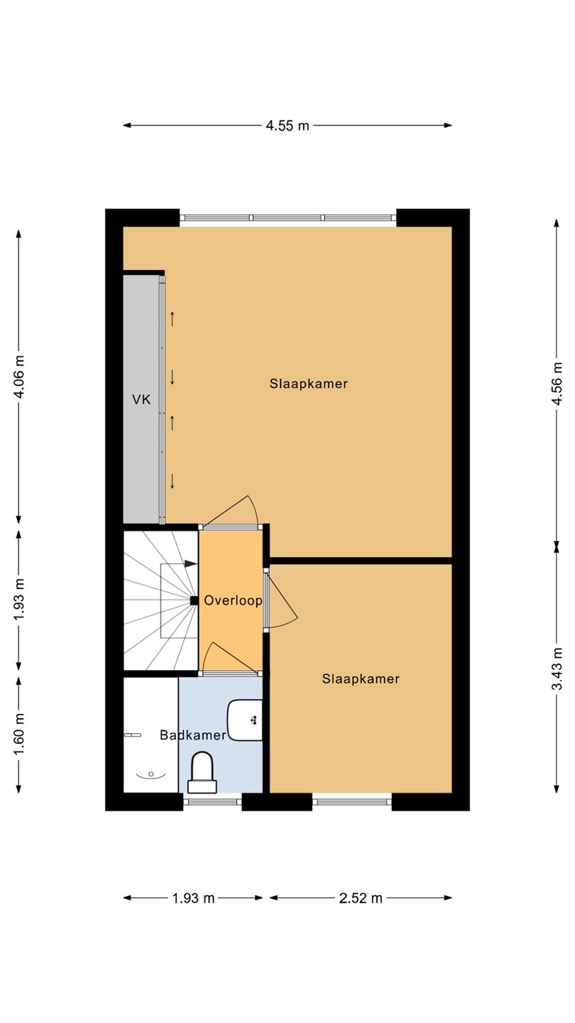 Verdieping: overloop, twee slaapkamers, badkamer.