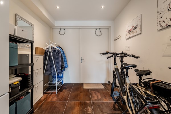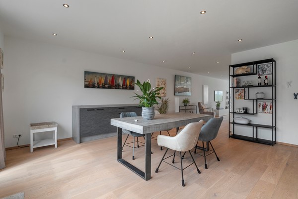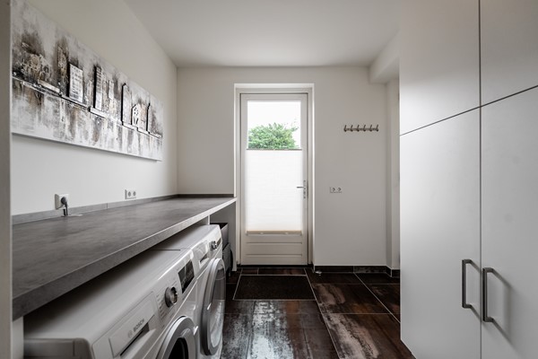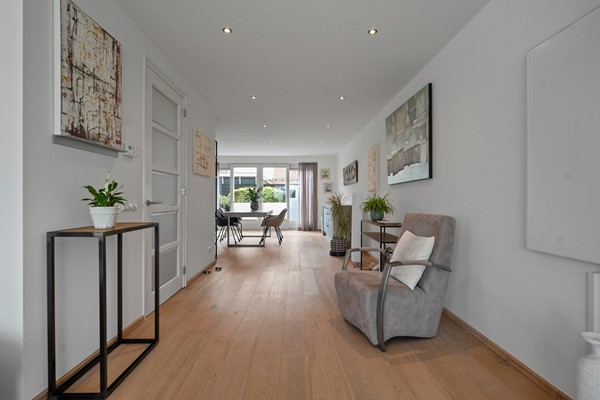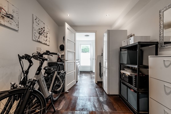 Parkeren op eigen oprit voor de garage/berging. Entree garage/berging door een dubbel openslaande deur en entree woning. U komt de woning binnen in de hal met meterkast (laadpaal aansluiting), trapopgang en het toilet. Vanuit de hal komt u in een royale living met aan de voorzijde de woonkamer en aan de achterzijde de keuken/eetkamer. De keuken is in een rechte opstelling geplaatst en voorzien van al het gewenste inbouwapparatuur onder een granieten werkblad. De gehele begane grond is getukt en voorzien van een verlijmde eikenhoutenvloer met daaronder vloerverwarming. Vanuit de keuken komt u in een praktische bijkeuken met de aansluitingen voor wasmachine/droger en inpandige toegang naar de berging/garage en toegang tot de achtertuin op het Zuiden. De achtertuin is tevens toegankelijk via een schuifpui vanuit de keuken. Middels een hardhouten trap komt u vanuit de hal op de riante overloop van de eerste verdieping. Deze biedt toegang tot de 3 prima slaapkamers (ca.18-17 en 7m2) en de badkamer. De geheel betegelde badkamer is voorzien van vloerverwarming en meer dan volledig ingericht. Het biedt een douche, ligbad, wastafel en toilet. Over de gehele verdieping ligt er een zwevende eikenhoutenvloer en ook hier volledig stukwerk.  Op de tweede verdieping vindt u de vierde slaapkamer van bijna 25m2 groot en nog een vaste kast die vanaf de overloop is te bereiken.